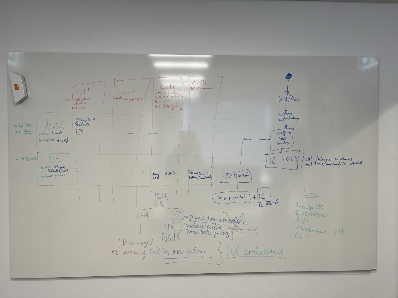One of those gutters started at my whiteboard. I have a whiteboard in my room where I sketch and explain – it is where many ideas have started, and I suspect my team has learned to pay attention when something goes up on it. I love working with whiteboards. Being able to draw, erase, and redraw on the spot, especially with someone else in the room, is where the magic happens. That day, I was explaining to a work shadow how a product development organization is structured – where UX professionals work, what they do, how the matrix of products and channels creates different needs for different teams. I sketched as I talked: product tribes as columns, channel tribes as bars, and their intersections as crossroads.